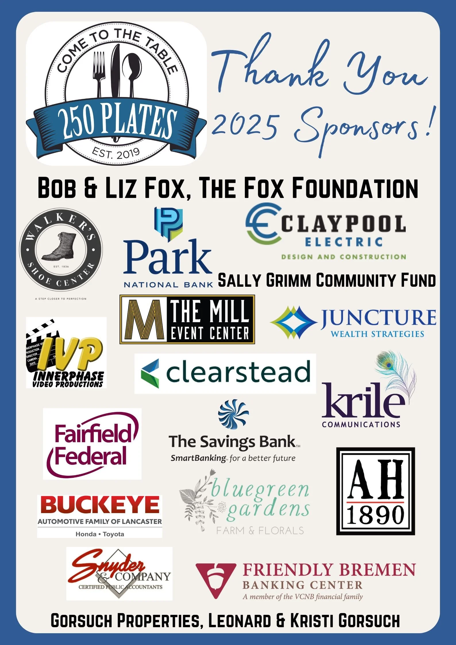 Bob & Liz Fox- Fox Foundation | Walker’s Shoe Center | Park National Bank | Ale House 1890 | Juncture Wealth Strategies | Innerphase Video Productions | Claypool Electric | The Mill Event Center | Sally Grimm Community Fund